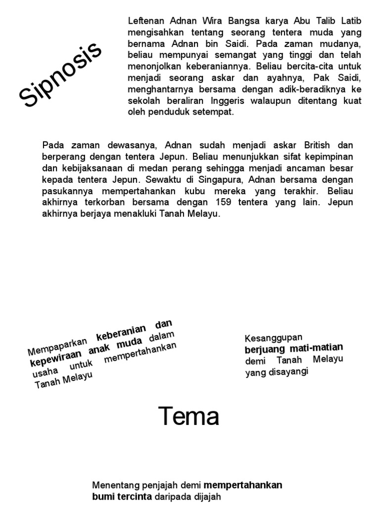 The film chronicles the actions of Adnan bin Saidi who had been involved as a Lieutenant of the Malay Regiment fending. JAWAPAN: Berdasarkan novel yang saya kaji iaitu novel Leftenan Adnan Wira Bangsa karya Abdul Latif bin Talib, terdapat satu watak sampingan lelaki. Tema novel ini ialah keberanian seorang anggota tentera dalam mempertahankan tanah air.